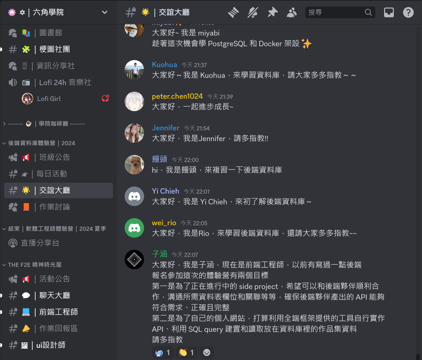- 進入「後端資料庫體驗營|2024」Discord 頻道內的交誼大廳